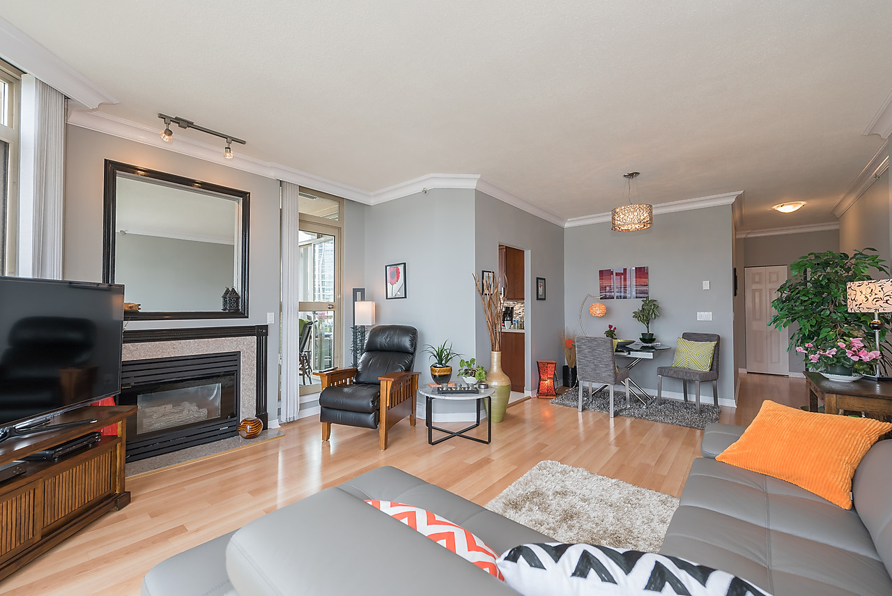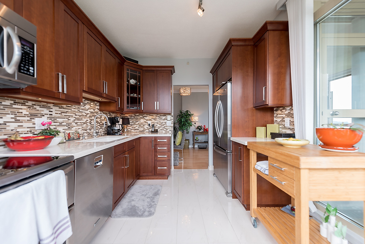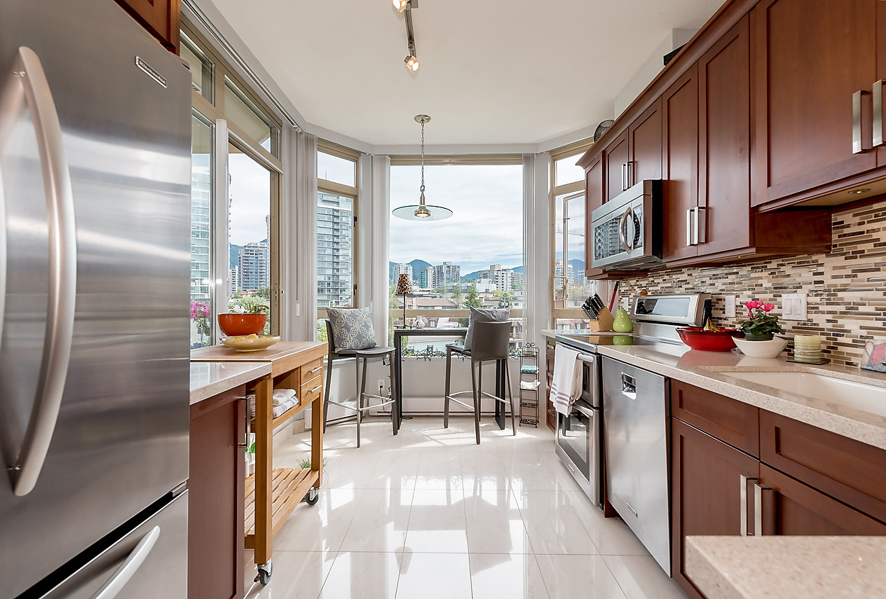 You will appreciate this suite with brand new kitchen including top of the line appliances, plus eating area, the gleaming engineered hardwood floors, designer colours and airy 9' high ceilings. Enjoy sensational sunsets from the westerly views focusing on Lions Gate Bridge and the majestic North Shore mountains. The spacious floor plan with 2 bedrooms and 2 bathrooms boasts a large master bedroom with luxurious ensuite. Relax by the cozy gas fireplace. Victoria Park West is a well run building with fabulous amenities including well equipped work-out room, whirlpool, amenity room with sunny patio and guest suite